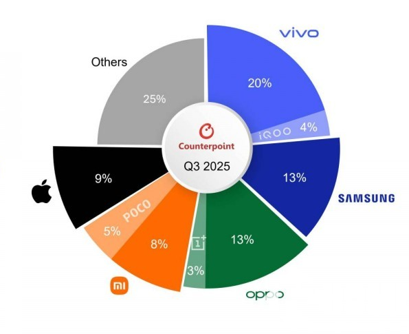 根据Countpoint的最新报告显示,2025年第三季度的印度智能手机市场表现良好,vivo、三星、OPPO、小米、苹果分列市场前五。